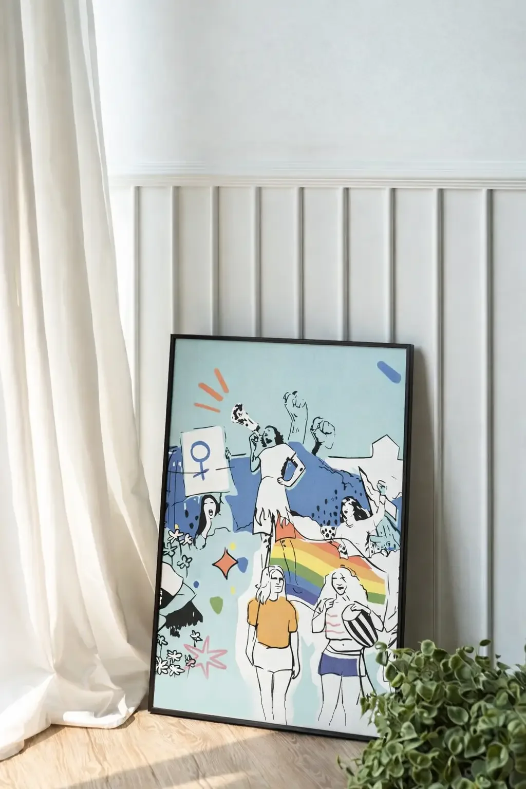 El encargo consistió en desarrollar una ilustración digital capaz de representar la pluralidad de participantes —mujeres jóvenes, mayores y migrantes— en un ambiente reivindicativo pero también alegre, colectivo y esperanzador.